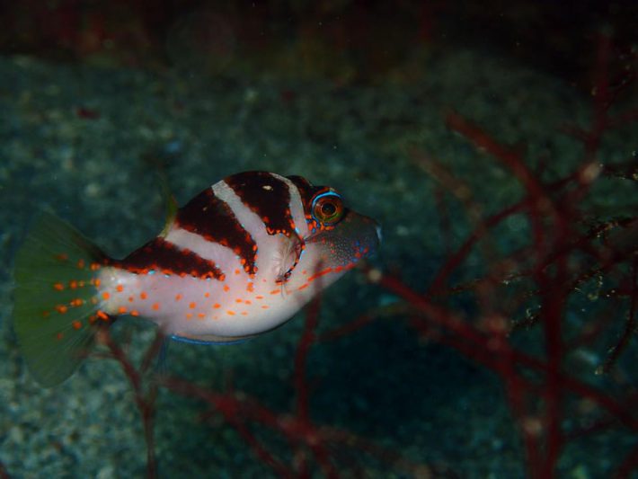 ?の上に、とっても小さな赤いアカホシウミタケハゼが